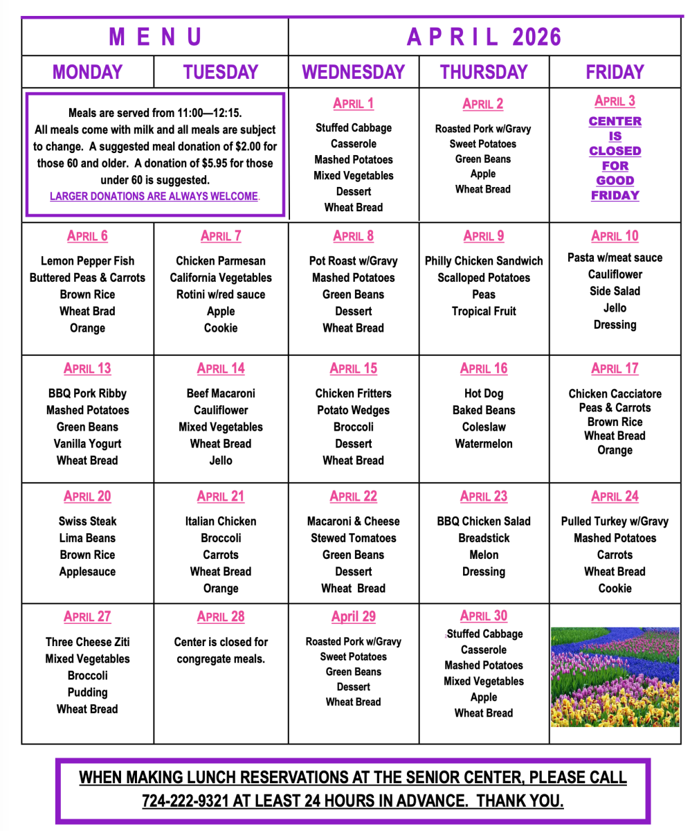 For the kitchen to be able to serve enough food for all seniors who want lunch, reservations must be made by noon. There is a suggested $2.00 donation for any lunch.